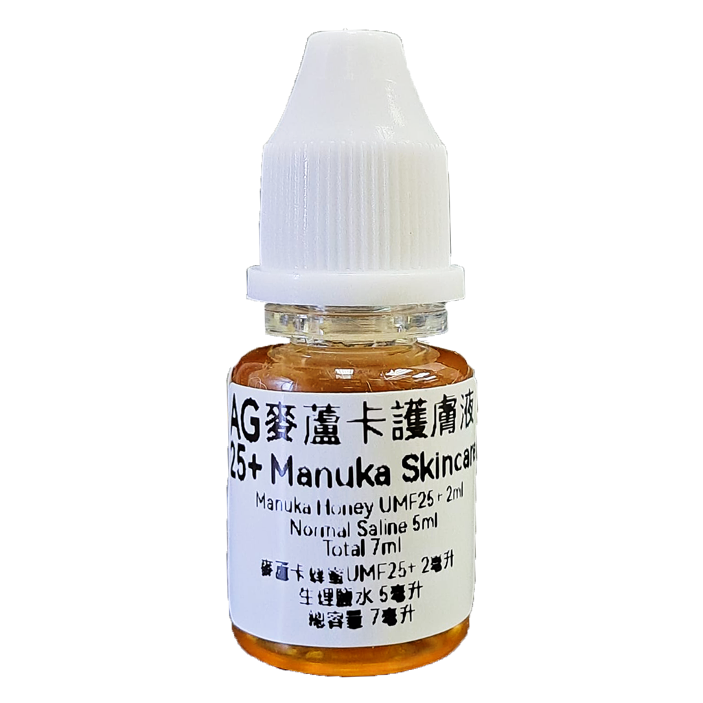 AG25+ Manuka Skincare combines the actions and benefits of both normal (physiological) saline and Manuka honey, making it a super liquid preparation for skincare. Normal saline is widely used for cleaning, washing and irrigation of skin surfaces, body cavities and wounds with great effects. It helps exfoliate and cleanse the skin from dirt, micro-organisms and infection. Being isotonic with body fluid and having water-holding properties, it is most compatible with living tissue and maintain moisture for the skin. Honey has been used since ancient time to treat multiple conditions. Manuka Honey is extensively used for treating minor wounds and burns and inflammatory skin conditions with remarkable effects. Honey is a complex natural product containing many useful substances, which work together to provide a synergistic antioxidant effect and anti-inflammatory activity and stimulate immune responses which are essential to healing and regeneration. Hydrogen peroxide in honey gives it anti-microbial action. In addition, Manuka Honey uniquely has Methyglyoxal (MGO), which has strong and broad spectrum anti-microbial action.